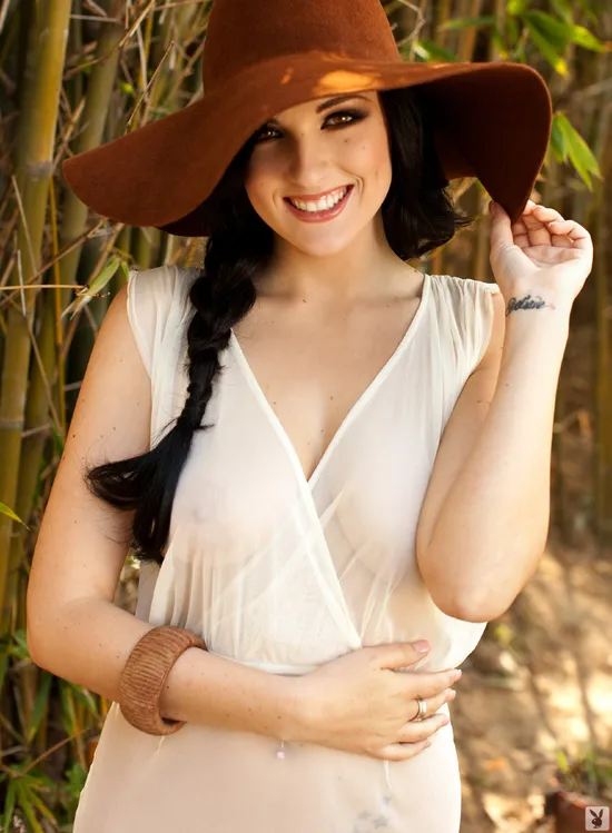 Our voluptuous Cybergirl of the Month for May 2011 roams a rock garden in her white sheer dress, high heels and brown, floppy sun hat. Kaya Danielle loved posing photographer Barry Fontenot. Whether she's laughing at the camera or seducing the lens, green-eyed Kaya will always leave Playboy fans entranced.