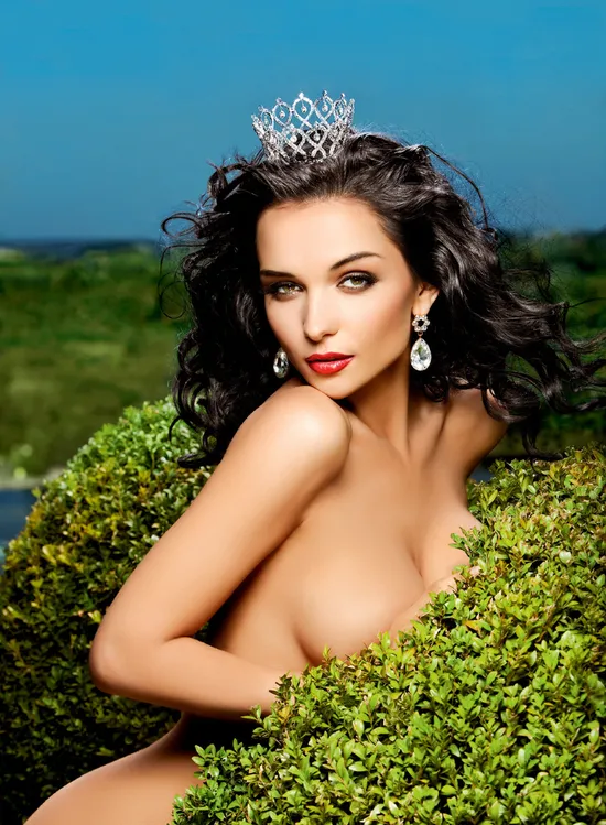 Our Cybergirl of the Month for August 2011 is Ukraine's Eugenia Diordiychuk, but judging by her latest pictorial by photographer Dima Baranov, one could swear she was a young Elizabeth Taylor. The dark-haired Ukrainian embodies the Oscar-winning actress's elegance with her diamond earrings and tiara as she presses her voluptuous figure against a shrub. Eugenia Diordiychuk is a classic beauty.