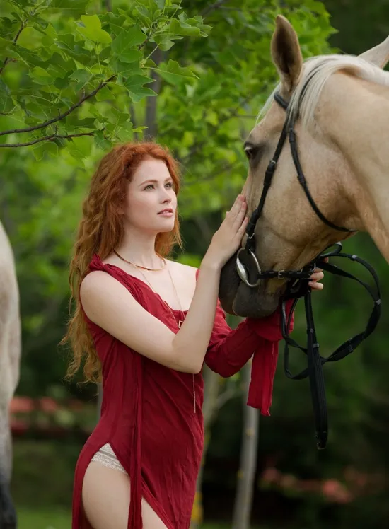 Let the beautiful International model, Heidi Romanova take the reins in this lovely pictorial from the photographer, David Merenyi. Barefoot, dressed in an exquisite red dress, Heidi looks irresistible outside with several horses surrounding her. A total animal lover, she is more than comfortable on set. "I like to make beautiful pictures and videos," says Heidi. "My passion is photography!" An easy-going woman, Heidi loves to kick back and enjoy the simpler things in life. "I like to stay at home," she laughs. "I think my special talent is that I can be happy with simple things - I [don't] think many people can do that." Feeling free and connected to the horses, Heidi begins to undress slowly and seductively until she is fully nude, totally immersed in the shoot. "I like all parts of my body, but my favorite is my legs," she tells us confidently. "They're long and beautiful!" When it comes to relationships and sex, Heidi likes a guy who is caring and funny. "The most important quality is a man's sense of humor," she tells us. "My best piece of sex advice for both men and women is to just love each other," she says. Make sure to check out all of Heidi's gorgeous pictorials, right here on Playboy Plus!