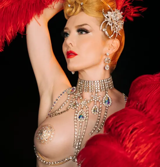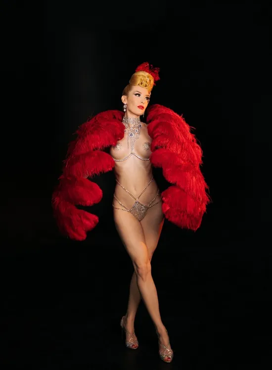 Miranda's passions and professions come together for this unique second feature from the photographer, Madeline Northway. Miranda shines in front of our cameras, wearing a burlesque costume and feather fans that she made herself. "My occupation? Burlesque showgirl, model and costumier," shares Miranda. "I passionately believe that expressing my sexual identity through my performance, modeling, and costuming work, and owning and monetizing my image, is a feminist act." Originally from England, Miranda tells us what she loves most about her hometown. "I'm one of those rare people who was actually born and raised in London," she smiles. "I feel extremely lucky to have grown up in such a cosmopolitan city, full of art, culture, and history - it's so varied, diverse, and constantly evolving." Now based in Los Angeles, Miranda's career is thriving, which is how we initially met - at a show! "I met Madeline at my first performance back in June, and we started discussing shooting. She was so respectful of my style and aesthetic and completely open to my ideas," shares Miranda of her photographer. "She allowed me to be myself, so these photos feel very personal to me." Make sure also to check out Miranda's debut pictorial, shot in a garden, right here on Playboy Plus!